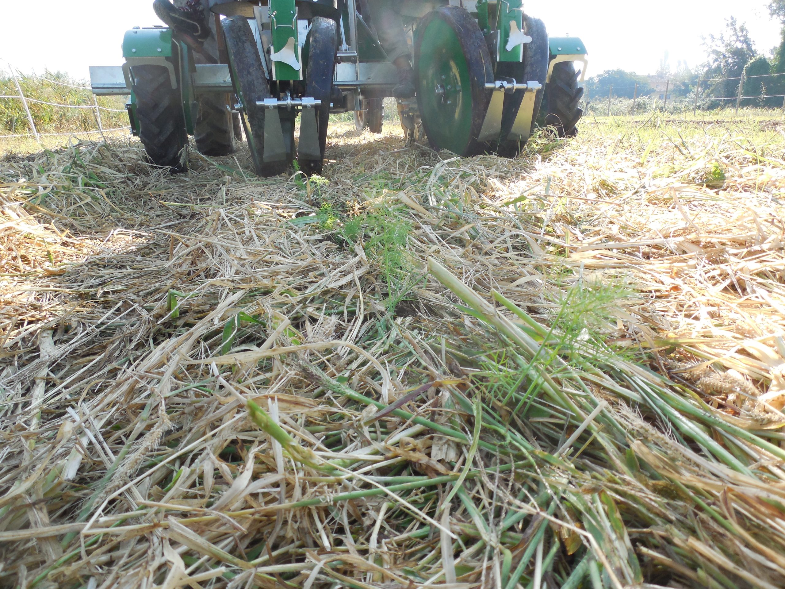 La terminazione delle cover crop con roller crimper ha inoltre dimostrato sostanziali vantaggi energetici e agro-ecologici rispetto alla pratica del sovescio, come la maggiore efficienza energetica e un maggiore accumulo di carbonio nel suolo. D’altro canto, i residui lasciati sulla superficie del suolo rallentano generalmente il tasso di decomposizione e il rilascio di azoto rispetto alla loro incorporazione (sovescio) con possibili effetti sulle rese degli ortaggi.