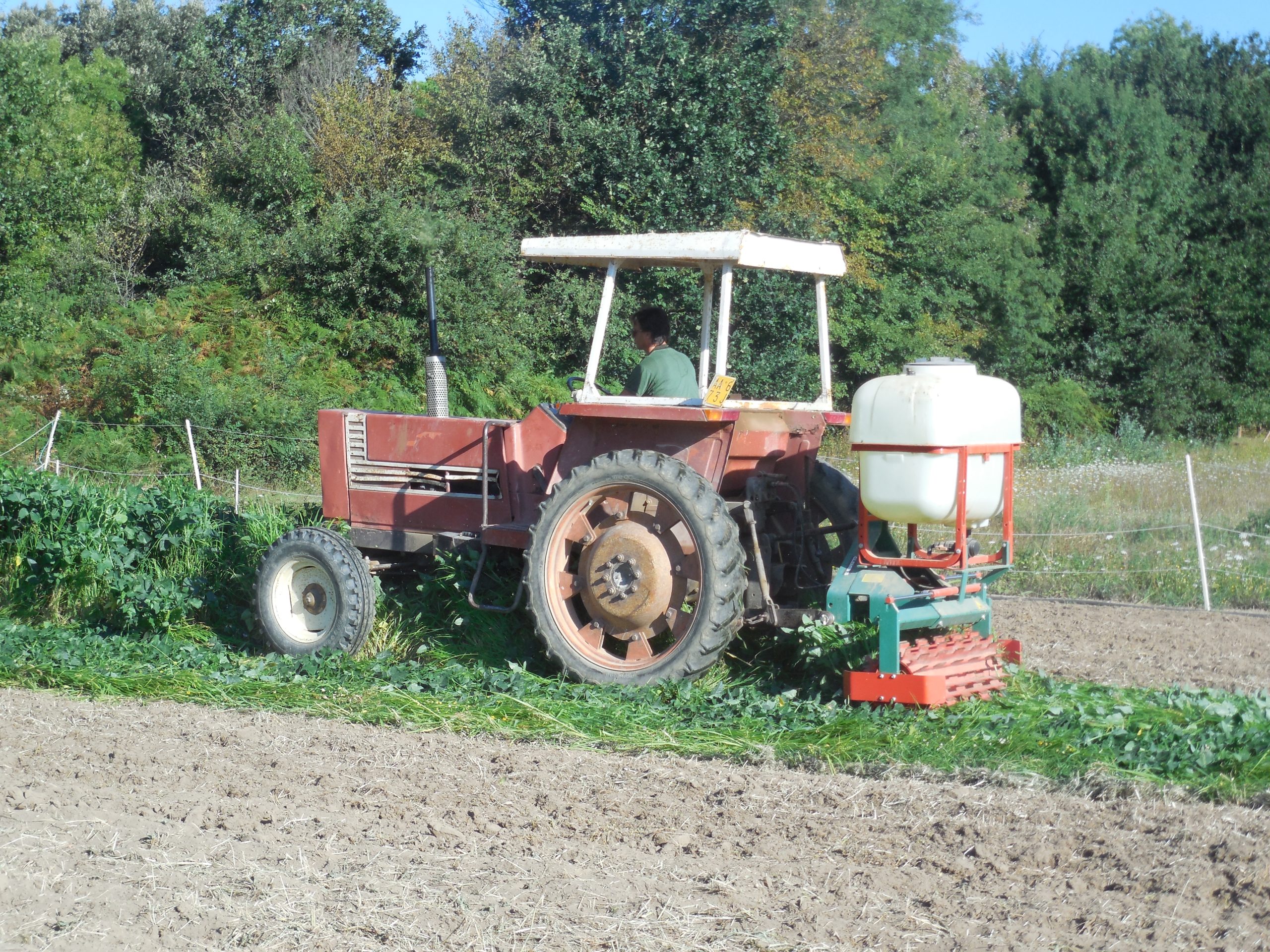 La terminazione delle cover crop può essere effettuata con il roller crimper, un rullo cilindrico dotato di lame di diverse forme disposte sulla sua superficie (foto 4). Durante l’utilizzo, le lame comprimono gli steli delle cover crop senza disturbare il suolo. L’azione principale consiste nello schiacciare gli steli senza solitamente tagliarli completamente, provocando lesioni che accelerano il processo di senescenza della vegetazione. Questi rulli non essendo azionati dalla presa di forza possono essere utilizzati a velocità relativamente elevate (circa 10 km/h).